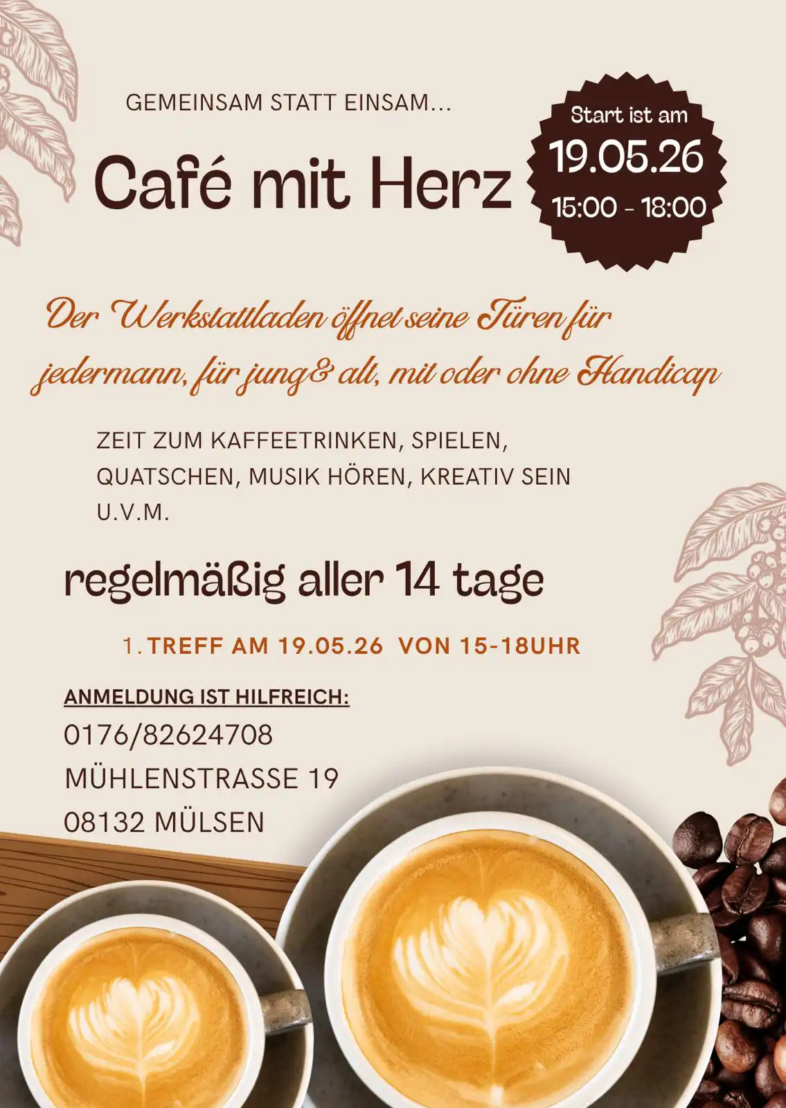 Sobald der Neubau des Werkstattladens fertig ist, wird Mittwochs von 14:30 bis 17:30 Uhr für alle Menschen, besonders auch jene mit Handicap der Werkstattladen zu einem Begegnungsort. Zeit für eine Tasse Kaffee, süße Leckereien und Spiele in einer offenen, freundlichen Atmosphäre. Lasst uns gemeinsam eine schöne Zeit verbringen, kreativ sein und neue Freundschaften knüpfen.